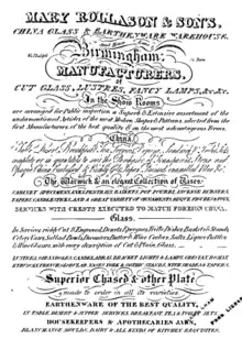 Rollason appears to have moved her business into pottery, where she was the dealer.[1] She sold her goods to the middle-classes from her business but she also operated as a wholesaler. She dealt in brass and cut-glass which was created at a manufactory she owned. The manufactory was nearby in Steelhouse Lane and in 1825 she brought her son into the business styling the company "Mary Rollason and Son".[1] They had a trade card for "Mary Rollason & Son's" advertising their china, glass and earthenware warehouse.[4] Their 1825 advert advised readers that they sold and made cut-glass, lustres and fancy lamps.[2]