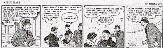 Many reference sources[2] state that Mary Worth was a continuation of Publishers Syndicate's Depression-era strip Apple Mary, created by Martha Orr in 1934, centering on an old woman who sold apples on the street and offered humble common sense.[3] Though usually called "Apple Mary", the character's full name is given as Mary Worth in at least one 1935 strip. Apple Mary ran through 1938,[4] at which point, writes comics historian Don Markstein, "It's generally thought that under a new writer (Allen Saunders, whose credits include Kerry Drake and Steve Roper) and artist (Dale Connor, formerly Orr's assistant), it gradually metamorphosed into Mary Worth.[4] As late as February 1940, the strip appeared as Apple Mary, subtitled Mary Worth's Family. (See example below.)