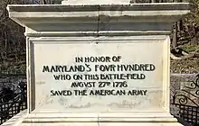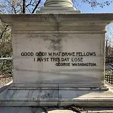 On the east face of the monument's square base is an inscription honoring the participating Maryland 400 soldiers. The inscription reads: "In honor of the Maryland 400 who on this battlefield on August 27, 1776 saved the American army." The west face of the marble pedestal has another inscription, which is a comment attributed to Washington as he watched the Marylanders hurl themselves at the enemy. It reads: "Good God! What brave fellows I must this day lose."