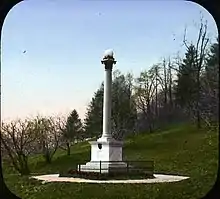 The Maryland Monument is located in Prospect Park, in Brooklyn, New York City, on the slopes of Lookout Hill. Originally envisioned by Stanford White, the same creator of the Prospect Park Panthers (1898) as well as the Horse Tamers (1899). The New York Times described the monument as a "monolith of Maryland granite with bronze tablets on the four sides".[18] The monument was built for $3,000, all of which donated by an organization by the name of "the Maryland Society of the Sons of the American Revolution."[19] The monument is 27 feet tall, faces southwest, and is enclosed by a wrought-iron fence. It contains a 12-foot polished granite Corinthian pillar with a marble orb on top and backed by a semicircular stone wall. There is a marble pedestal which was donated by the Brooklyn Parks Department.