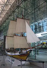 Maryland Federalist was built with private funds raised by the Maryland Federalist Foundation.[1] She was designed by Melbourne Smith and built by Allen C. Rawl. According to her builder, she was "built as a full scale historic representation of the original vessel [Federalist] from written documentation and notes that describe the original small ship designed and built by ... Joshua Barney in 1787 [i.e., 1788]."[2] The ship is rigged with seven sails to commemorate Maryland's place as the seventh state to ratify the United States Constitution. She is painted in the colors of the flag of Maryland (red, white, black, and gold) and decorated with other state symbols.[1] The Maryland Federalist Foundation gave the ship to the Maryland State Archives on July 1, 1988, and she is displayed at BWI Airport or in the Maryland State House.[1]