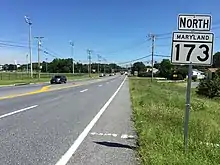 MD 173A is the unsigned designation for a bypassed section of MD 173 near the intersection of that highway and Edwin Raynor Boulevard. MD 173A runs 0.14 mi (0.23 km) from MD 173 north to Rock Hill Road near Jacobsville.[1][21] The state highway was assigned in 2001 when the intersection of MD 173 and Edwin Raynor Boulevard was rebuilt so the roads meet at a right angle.[22]