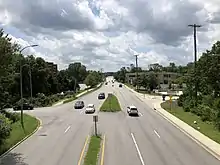 The original segment of MD 174 was paved as a concrete road by 1921.[12][4] This segment extended west from MD 3 in Glen Burnie southwest along Quarterfield Road to a spot just west of what became its partial cloverleaf interchange with the Glen Burnie Bypass (now I-97) in 1956.[11][13] MD 174 was relocated for the construction of the interchange; part of the old road became MD 779. MD 174 was extended east from MD 3 Business along Aquahart Road and south along Oakwood Road to its interchange with MD 177 (now MD 100) in 1969.[14] The state highway was rolled back to its present terminus at MD 3 Business by 1974.[15] Donaldson Avenue, a county highway, was relocated near its western end to form a four-way intersection with MD 170 and MD 554 in 1981.[16] In 1983, MD 174 was extended west over Quarterfield Road, Donaldson Avenue, and MD 554 to its present western terminus at the edge of Fort Meade.[17] The state highway had been expanded to a four-lane divided highway around its intersection with MD 170 and its interchange with MD 100, and widened to four lanes on much of its Quarterfield Road segment by 1999.[18] MD 174 was expanded from a two-lane road to a four-lane divided highway through its interchange with I-97 when that interchange was reconstructed in 2004 and 2005.[19][20][21]