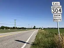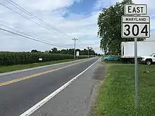 Maryland Route 304 (MD 304) is a state highway in the U.S. state of Maryland. The highway runs 15.23 miles (24.51 km) from Spider Web Road near Centreville east to MD 312 in Bridgetown. MD 304 connects Centreville with U.S. Route 301 (US 301) and several small settlements in central Queen Anne's County and northern Caroline County, including Ruthsburg and Bridgetown. The first sections of modern MD 304 were improved in the 1910s, but much of the highway from Centreville to Ruthsburg was constructed from the mid-1930s to the early 1940s. The part of the highway west of Centreville was constructed as Maryland Route 606 and became part of MD 304 in 1950. Since the 1950s, the highway through Centreville has been municipally maintained. MD 304 was extended east to MD 405 and replaced that route to Bridgetown in the 1960s. The US 301 junction became a superstreet intersection in 2011 and a double-roundabout partial cloverleaf interchange in 2017.