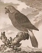 The Mascarene parrot was first mentioned by the French traveller Sieur Dubois in his 1674 travelogue and only described a few times from life afterwards. At least three live specimens were brought to France in the late 18th century and kept in captivity, two of which were described while alive.[2] Today, two stuffed specimens exist; the holotype, specimen MNHN 211, which is in the Muséum National d'Histoire Naturelle in Paris, while the other, specimen NMW 50.688, is in the Naturhistorisches Museum in Vienna. The latter specimen was bought from the Leverian Museum during a sale in London in 1806.[2] A third stuffed specimen existed around the turn of the 18th century.[3] The Mascarene parrot was scientifically described as Psittacus mascarinus (abbreviated as "mascarin") by the Swedish zoologist Carl Linnaeus in 1771.[4] This name was first used by the French zoologist Mathurin Jacques Brisson in 1760 but was not intended as a scientific name. The name is a reference to the Mascarene Islands, which were themselves named after their Portuguese discoverer, Pedro Mascarenhas.[2]