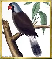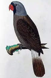 The Mascarin is found at Ile Bourbon [Réunion]; I have seen several alive in Paris, they were rather gentle birds; they had in their favour only that the red beak contrasted agreeably with the dark background of their plumage; they had not learnt to talk.[2]