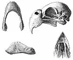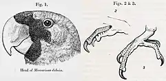 In 1879, Forbes stated the cere was covered by feathers which concealed the nostrils.[6] This contradicts other accounts that mention that the nostrils were surrounded by red skin. Forbes based his description on the Paris specimen which had its skull and mandible removed for study by the French zoologist Alphonse Milne-Edwards prior to 1866. This may have led to the distortion of the shape of the head and nostrils as indicated by the illustration in Forbes' article.[2][26] The skull of the Mascarene parrot was moderately flattened from top to bottom, the diameter of the nares (bony nostril) was larger than the width of the internal septum (the wall between the nostrils), and there was an indistinct notch on the upper edge of the rostrum (bony beak). The mandibular fenestra (opening at the side of the mandible) was absent, and the back end of the mandibular symphysis (where the two halves of the lower jaw connected) was broadly oval, the angulus mandibulae (the lower margin at the back of the mandible) was flattened instead of angled, and the symphysis was sharply angled downward.[2]