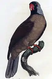 Upperparts of head and neck clear (ash) grey. Back, rump, underparts of neck, breast, belly, sides, legs, scapular feathers, upper coverts of tail very-dark (ash) grey. Wing feathers of the same colour. The tail is composed of 12 feathers: the two median ones are also very-dark (ash) grey. All the lateral ones are of the same colour, except that they have a little white at their base. The eyes are surrounded by a naked skin, bright red. Pupil black, iris red. The base of the superior half of the beak is also surrounded by a red naked skin in which the nostrils are placed. Beak similarly red. Legs pale flesh. Claws grey-brown. I am unaware from which country it is found. I have seen it living in Paris.[2]