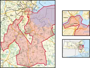 Massachusetts's 8th congressional district is located in eastern Massachusetts, including part of Boston. It is represented by Democrat Stephen Lynch. For one congressional term (1791–1793), it served as the home district of the District of Maine. The district boundaries were significantly changed, as of the elections of 2012, due to redistricting after the 2010 census, with the old 8th district largely being shifted to the new 7th district.[3] The new 8th district comprises many of the communities of the old 9th district, as well as some easternmost Norfolk County communities and northernmost Plymouth County communities of the old 10th district.