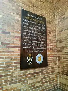This inscription hangs in the main stairwell of Massey College, which reads: "This House was built by the Massey Foundation in 1962. It was the intention of the Founders to bring into being a College to serve a body of graduates limited in numbers but of high promise in scholarship and qualified to make of worth the fellowship to which they belong. It is the Founders' prayer that through the fulness of its corporate life and the efforts of its members, the College will nourish learning and serve the public good."