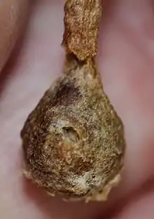 The female spiders have a large spherical abdomen with a milky white base often covered in darker brown patterns and a smaller brown carapace.[2] There is a clear distinction between the two sexes as extreme sexual dimorphism results in much larger females. Although both sexes hatch with their cephalothorax range being around 0.5 mm, the female develops into a significantly larger specimen than her male counterpart. The size difference coheres with the divergence of their respective hunting behaviors. While female bolas spiders hang from a horizontal thread waiting to swing her bolas or sticky orb towards her nearby prey (typically moths), the males do not use a bolas but implement hunting tactics reminiscent of early-instar spiders.[5]