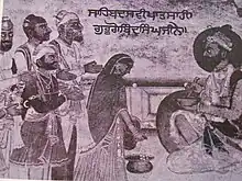 ![]() Detail of Mata Jito appending sugar crystals to Amrit during Vaisakhi 1699 from a fresco that was located in the original Akal Takht building | |