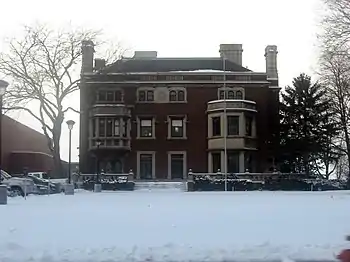 The survival of this homestead is a boon to Cleveland architectural historians and provides them a glimpse into early 20th century residential dwelling construction.[12] The house, as was the fashion of many historic homes at the time, sits well back (more than ten yards) from the street grid and resembles a southern plantation or an English Manor House or Great House more than a city house.[13] Many of these homes therefore sported huge front lawns that needed to be meticulously manicured by staff or groundskeepers, their duties would include tending the many lavish gardens around the property.[14][15] The house seems out of place in today's modern world but this is probably because almost all of its peers are gone. When looked at from a historical standpoint, the house would not look so out of character with its many neighbors had they survived destruction and razing. It is too easy to say that it is a relic when placed alongside the sleek, modern Cleveland State buildings. [16] [17]