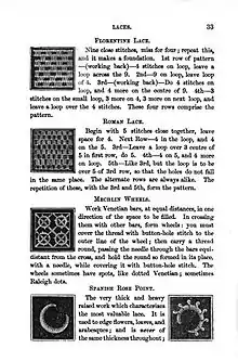 In America, Pullan was able to pursue a project of writing a comprehensive illustrated encyclopedia of fancywork. The Lady's Manual of Fancy-Work (1859) was wide-ranging, even encompassing patchwork, which was not usually included in needlework and fancywork books.[4]