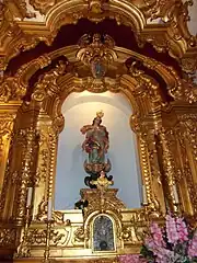 The interior is wide and in a single nave covered by a barrel vault. The nave is strengthened by three robust toroidal arches and the walls are decorated by nine Joanino (King John's style) Baroque altars, in gilded woodcarving, displaying 18th century sculptures. Its retables are notable, especially the one from the chancel, exceptionally rich, in rococo style, made-up by six composite order capital columns. The Rocaille woodcarvings were created in the beginning of the style in Entre-Douro-E-Minho, between 1755–1758, and was the work of André Ribeiro Soares da Silva (1720-1769).[3]