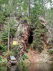 The Porte de l'enfer (Hell's Gate) is a peculiar cave in the river's bank speculated to be a native ochre mine. In 1761, Alexander Henry the elder reported on this cave and the myths surrounding it. It was said to be inhabited by an evil and fierce demon, hence its name.[2]