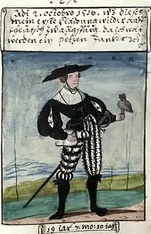 Matthäus Schwarz (19 February 1497 – c.1574) was a German accountant, best known for compiling his Klaidungsbüchlein or Trachtenbuch (usually translated as "Book of Clothes"), a book cataloguing the clothing that he wore between 1520 and 1560. The book has been described as "the world's first fashion book".[1]