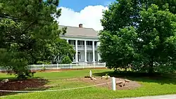 It is a Gothic Revival-style frame building with a two-story five-bay portico supported by six fluted Doric columns.[2]