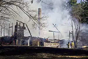 On April 3, 2010 around 1:58 P.M., the Coachman's Barn, which was customarily used for the Theater in the Open, caught fire. The Newburyport, Salisbury and Amesbury Fire Departments got the blaze under control around 3:30 P.M. Only the stone foundation and the chimney survived. The chimney has been taken down for safety reasons. The small house next to the barn was largely untouched.[7][8][9]