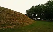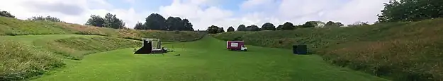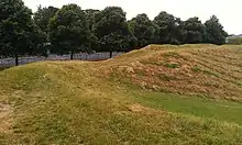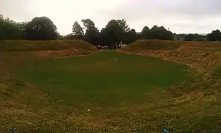 Maumbury Rings is a roughly circular henge situated close to the centre of Dorchester.[1] It has an internal diameter of around 50 metres.[2] The bank has an average width of 4 metres, and is around 5.6 metres high internally and 4.0 metres high externally.[2] A bulge in the earthworks to the southwest marks the site of a gun emplacement built during the English Civil War,[1] and the inner side of the bank was terraced on the east and west sides at this time.[2] There is no trace of the original internal ditch.[2]