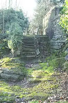 Leading up from the road to the garden of the hall is a flight of eight sandstone steps that are dated 1653. They are protected on the outside by a sloping parapet with roll-moulded coping. The steps incorporate an enclosed viewing platform on an open-topped turret with loopholes on its sides. They were designed as a Grade II listed building on 22 October 1952.[4] Grade II is the lowest of the grades of listing, and is applied to buildings that are "nationally important and of special interest".[3]