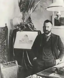 Back in Vienna, the following year he practiced with several architectural firms,[1][3] among them Franz von Neumann, a prominent historicist, and the brothers Anton and Josef Drexler, who at the time were moving from historicism towards Secessionstil. In 1899 he became member of the architects association "Wiener Bauhütte"[3] and participated at the competition for redesigning Vienna's Central Cemetery. In 1900 he was announced as the winner of the first prize and, after having revised and adapted his plans, he received the opportunity bring his project to life. Among the jury members sat Otto Wagner,[4] one of the pioneers of Viennese Art Nouveau architecture, whose work had played a great influence on the young Hegele.[1]