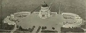 Two curving colonnades embrace the square in front of the entrance, visually extending the wings of arcades on both sides of the church. Those colonnades, erected between 1906 and 1907, host a columbarium and other graves.[7]