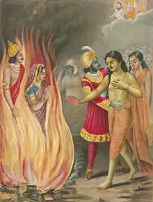 While Agni is the saviour in the Kurma Purana, the Rama-centric Adhyatma Ramayana replaces Agni with the omniscient Rama as the mastermind. Rama knows of Ravana's intentions and orders Sita to place her chaya (shadow) outside the hut for Ravana to abduct and go inside the hut and live hidden in the fire for a year; after Ravana's death, she would unite with him again. Sita complies and creates her illusionary form, Maya Sita, and enters the fire. After Maya Sita's seizure, Rama grieves for Sita. It is unclear if Rama pretends to grieve or forgets that Maya Sita is the one actually kidnapped. After Ravana's death, Maya Sita has to face the Agni Pariksha and vanishes in the fire. Agni reinstates Sita and declares that Rama created the illusionary Sita to bring about Ravana's annihilation and with that purpose served, the true Sita returns to Rama.[7] Inspired by Adhyatma Ramayana, the Ramacharitmanas has a very similar narrative; however, Agni Pariskha narrative is longer and Maya Sita is explicitly stated to be destroyed in the fire.[10] The Nepali Bhanubhakta Ramayana by Bhanubhakta Acharya (1814–1868) portrays Rama creating the illusionary Sita from the sacred Kusha grass and entrusting Sita to Agni; at Agni Pariksha, the grass Maya Sita turns into ashes while the true Sita reappears before the world.[8] A popular Indian television series Ramayan (1987–88) by Ramanand Sagar reveals that Maya Sita had replaced Sita only in the Agni Pariksha scene and uses flashback to narrate about the exchange.[18]