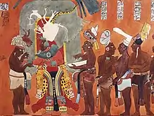 The evidence for body painting among the Maya largely comes from various murals. One mural found in Bonampak, Chiapa shows a man being painted red from the neck down by a servant while a woman's face is painted red.[12] Another mural found at Calakmul depicts merchants and non-elites wearing face paint of various colors and designs, suggesting that paint may have been used to differentiate class and gender.[15]