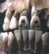 Most likely teeth were modified as a part of ritual or for aesthetic purposes, and younger children usually did not have modified teeth.[13] Once their permanent teeth had arrived, adolescent warriors had their teeth filed to sharp points to give them a fierce appearance, and as a further mark of status.[4] Maya women filed their teeth, or had holes drilled into them where precious stones or luxury materials, such as jade, pyrite, hematite, or turquoise could be inlaid into the teeth.[12] High-status women often had their teeth filed, in different patterns, and would have jadeite, hematite, pyrite, turquoise, or other decorations inset into holes drilled in their teeth.[4] Depending on the material, the meaning of the inlay varied. For example, jade symbolized pure breath or the ability to express elegant speech.[12]