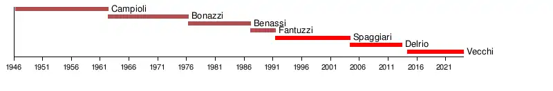 Since 1995, under provisions of new local administration law, the Mayor of Reggio Emilia is chosen by direct election, originally every four and since 1999 every five years.
