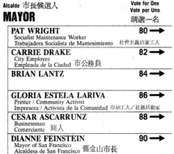 Feinstein did not face any significant opposition during the 1983 San Francisco mayoral election and won with 117,489 votes for 80.10% of the popular vote against five other candidates.[134][135] This was her last election as mayor due to her being term-limited by the 1987 election.[136]