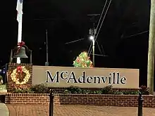McAdenville was incorporated in 1881. It was named after Rufus Yancey McAden, president of McAden Mills, the town's textile mill. McAden had served in the North Carolina House of Commons from 1862 to 1867, and was Speaker of the House in 1866. He came to Charlotte in 1867 to become president of the two-year-old First National Bank.[5] Pharr Yarns, a yarn manufacturing company, was founded in McAdenville in 1939. It grew to become a major employer and sponsored various projects in the town during its existence. It was sold in 2019.[6]