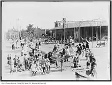 It was the third supervised children's playground on municipal property that was managed by the Toronto Playgrounds Association,[53] after St. Andrew's Playground on Adelaide Street in 1909[34][53][54][55] and Osler Playground on Argyle Street in 1910.[56][57][58] Emulating the playgrounds of the Chicago South Park Commission,[27][28] it was the association's first playground to have an indoor recreation centre that operated all-year.[59] It was the largest permanent playground in Toronto[60] and its area grew in 1957 when Toronto City Council acquired an additional 0.41 hectares (1.0 acre) of adjacent land for $125,000[61] ($1.2 million in 2021 dollars).[29]