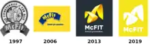 The first studio opened in 1997 with a banana as the mascot in the logo and the words "The gym for everyone". Over the years, only the banderole with the brand name remained. The color scheme was always the yellow McFIT lettering on a bright blue background. Later the advertising message "Simply look good" followed as an addition on the logo. In 2013, there was a revision of the entire design, which is still current today: they revived the original banana, but developed it further and replaced it with a curved, yellow bow on an anthracite background. Underneath the bow is the white McFIT lettering. The adapted color scheme makes the logo look more discreet overall. The advertising message "Simply look good" (German: "Einfach gut aussehen") remained under the brand name.[15]