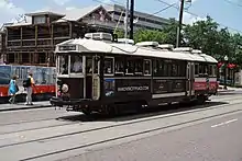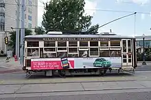Car 122 was built to a standard American design by the J. G. Brill Company of Philadelphia in 1909[2] for export to Porto, Portugal. Rosie is similar to early streetcars that once operated in Dallas. 122 was retired from service on the Porto streetcar system in 1978,[21] and was brought to the U.S. in the early 1980s by Gales Creek Enterprises (GCE), of Oregon, purchased by Portland businessmen Bill and Sam Naito for possible use on a then-proposed heritage streetcar line in Portland. GCE refurbished it at the Oregon Electric Railway Museum for use, on loan, in the first San Francisco Historic Trolley Festival, in summer 1983, and car 122 operated intermittently in service on San Francisco's Market Street in that year; it was painted yellow-and-cream,[22] the colors of its sponsor in the Trolley Festival, Eastman Kodak.[23] In fall 1984, No. 122 was sold to MATA, and it arrived in Dallas around the beginning of 1985. Having previously been refurbished for use in San Francisco, 122 only needed minor work to bring it into service on MATA's opening day. However, in the late 1990s car 122 received a more extensive restoration. Shortly afterward, 122 developed motor problems which kept it in the barn. These problems have been solved and 122 is currently the oldest streetcar in daily service in North America.[24]