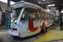 7169 is a Brussels-built single-end Westinghouse All-Electric PCC that was bought by MATA in 2013. Trams from the (7000 and 7100 series) were built between 1951 and 1971. The last subtype (7156–7171) were built in 1970 using salvaged components from Johnstown Traction Company PCC trams. MATA modified the car for their operations, including new left-side doors. The car entered regular service in mid 2015.