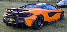 Unveiled online in December 2019, the 620R is a road legal iteration of the 570S GT4 race car. The car shares its Monocell II carbon fibre monocoque chassis with the 570S GT4 race car as well as the engine which, not subject to racing restrictions and ECU changes is now rated at 620 PS (456 kW; 612 hp) and 620 N⋅m (457 lb⋅ft) making it McLaren's most powerful sports series model. Other changes include semi-slick Pirelli P zero Trofeo R tyres with track only Pirelli racing slicks being optional, a bare minimum racing interior with the carpeting removed, carbon fibre racing seats with six-point harness, door pull straps, carbon fibre shift paddles, 12 o'clock mark on the steering wheel, McLaren Track Telemetry system (MTT) and deletion of air-conditioning and infotainment system; although they are available as no cost options, adjustable coilover motorsport dampers; which feature 32 individual settings per corner to allow the driver to tailor rebound and compression rates to their preferred settings, stiffer anti-roll bars have and track-focused carbon-ceramic brakes with 390 mm brake discs Arther front and 380 mm brake discs at the rear with forged aluminum calipers. The adjustable rear wing made from carbon fibre is shared with the 570S GT4 and allows the 620R to generate 185 kg (408 lb) of downforce at a speed of 250 km/h (155 mph). The large wheel sizes of the car (19 inch at the front, 20 inch at the rear) allow for no mechanical adjustment when the standard tires are switched for racing slicks. The rear wing has an integrated third brake light to make the car road legal.[18][19]