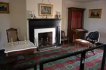 The McLean House was originally constructed by Charles Raine in 1848.[5] Eliza D. Raine's estate sold the house to Wilmer McLean in 1863. It had formerly been a tavern (not to be confused with the nearby Clover Hill Tavern, which Raine had previously owned). One of the first battles of the American Civil War took place on the farm of Wilmer McLean at the Bull Run tributary, the First Battle of Bull Run (First Battle of Manassas). Soon after that battle the McLeans, seeking to avoid the war, moved to the village of Clover Hill, Virginia (the name of which was changed to "Appomattox Court House," having just become the county seat). Because of the name of the village, many mistakenly think the surrender was signed in the courthouse building. (In years past, the county seats of many rural counties, especially in Virginia, had names that were simply the name of the county plus "Court House"; some of these remain today.)[6] The courthouse is about 3 miles (5 km) from the Appomattox Station where the trains came into Appomattox, Virginia.[7]