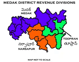 The district is divided into three revenue divisions of Medak, Narsapur and Tupran. These are sub-divided into 21 revenue mandals (15 Mandal Praja Parishads) and has 381 villages constituting 320 gram panchayats.[5] [12] Sri Rajarshi Shah, I.A.S.[13] is the present collector of the district.[14]