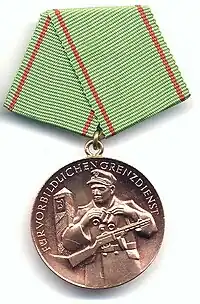 The Medal for Exemplary Border Service (German: Medaille für vorbildlichen Grenzdienst) was a national award issued in the German Democratic Republic (GDR). It was established on 28 May 1954, by the Council of Ministers of the GDR (German: Verordnung der Regierung der DDR) with Order No. 47/54 from the Ministry of Interior on 16 June 1954. The first presentation ceremony took place on 1 July 1954, to members of the German Border Police (German: Deutschen Grenzpolizei (DGP)).