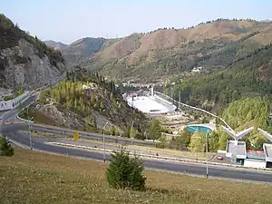 There is an unfinished dam further up in the valley at 43°05′04″N 77°04′41″E / 43.084436°N 77.078104°E. This dam was proved unnecessary due to the success of the Medeu dam and was abandoned due to cost constraints. It is currently the site of a meteorological station.