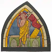 Judging from both written sources and archaeological discoveries, it was common to decorate churches lying within the current borders of Sweden with stained glass during the entire Middle Ages.[1] In general, churches were equipped with stained glass windows when they were built.[5] It is known from at least one occasion that a stained glass window was donated to a church by a clergyman,[1] but contemporary written evidence of window production or acquisition is generally scarce.[3] In cases where no actual windows remain, knowledge about their existence has been deduced from other sources. Some are known through earlier depictions, like the drawings made by Johan Peringskiöld of the stained windows of the church in Gamla Uppsala. He and other 17th-century antiquarians were primarily interested in heraldic and other historical traces that could be linked to the Swedish nobility, which is why they occasionally made drawings of stained glass windows showing coats of arms, but not necessarily other stained glass windows.[6] Later, during the 19th century and the early 20th century, cultural historian Pehr Arvid Säve and artist and teacher Gustava Meukow made more comprehensive copies of the church windows, some since lost and dispersed, on Gotland.[7]