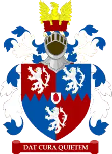 | Blazon | Quarterly per fess indented Gules and Azure three lions rampant Argent. |