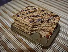 It is a dessert which is known for its lengthy preparation time. It consists of layers of sponge cake with a cream filling and is often covered with nuts or crumbs made from leftover cake. While the thin layers harden shortly after coming out of the oven, the moisture of the filling softens it again over time.[3] There are many recipes and variations of this cake, but, the main ingredient is honey, giving it the characteristic taste and flavor.[4]