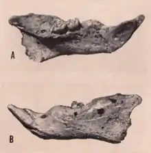 The mandible, which is severely damaged and lacks the condyloid, coronoid, and angular processes at the back of the bone, contains the second and third molar and part of the lower incisor, but the first molar is missing.[11] The capsular process of the lower incisor, a slight raising of the mandibular bone at the back end of the incisor, is small. The preserved alveoli, the impressions left by the roots, show that the first molar was supported by large roots at the front and back and a smaller root in between these. The second molar is about square and shows the four main cusps commonly present in rodents: the protoconid, metaconid, hypoconid, and entoconid. A strongly developed mesolophid (a crest) is also present, as in most oryzomyines. The main valley between the cusps, the hypoflexid, is broad and V-shaped. The third molar is as long as the second, but it is narrower and the entoconid is poorly developed. Again, the hypoflexid is broad and V-shaped.[12] The length of the toothrow at the alveoli is 8.7 mm. The length of the second molar is 2.5 mm and the width is 2.2 mm. The third molar has a length of 2.5 mm and width of 1.8 mm.[13]