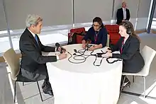 ![]() Chakrabarti (center) interviewing John Kerry in 2017 | |