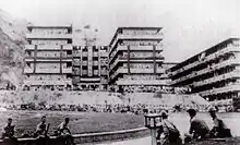 After a devastating fire in December 1953 that left thousands homeless, the Colonial government built a 29-block resettlement estate on the site of the burnt-down shanties to house the homeless victims.[2] Eight blocks (Blocks A to H), later renumbered as Blocks 10 through 13 and 35 through to 41, were constructed with the financial aid of the United Nations (Mei Ho House is Block H, later Block 41). These 7-storey blocks were constructed in the Bauhaus architectural style[3][4] with an 'H' configuration consisting of 2 residential wings, with communal sanitary facilities linking them.