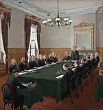 | 50 | Conference on Drafting a Constitution 枢密院憲法会議 Sūmitsuin kenpō kaigi | 18 June 1888 | Goseda Hōryū (五姓田芳柳) (1864–1943) | October 1926 | Itō Hirobumi explains the draft of the Meiji Constitution to the Emperor and the Privy Council | ![]() | Prince Itō Hirokuni (伊藤博邦) |