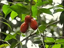 The fruit are elongated and cylindrical in shape. They measure up to 3.3 cm (1.3 in) long and 1.6 cm (0.63 in) diameter, and are initially green, becoming orange or red when ripe.[5] They are edible and sweet and have been compared to a sapodilla with a floral flavour.[7]
